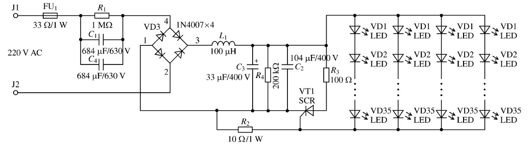 該電路共驅動140隻白光LED (小功率) ,采用35串4並的模式,采用電容降壓式驅動方式。其中, C1、C4 為並聯的兩個相同的電容,起降壓及限流作用; 4個1N4007組成的整流橋對輸入交流電壓進行整流;濾波電容C3 用於濾除整流輸出電壓中的交流成分,使電壓更為平滑; L1、C2 用於濾除輸出電壓中的高頻成分;電阻R4 為C3 提供放電回路;采用單向晶閘管SCR729210對電路進行保護, R3 為限流電阻。