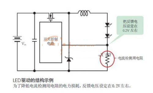 通常,開關穩壓器IC設定的反饋電壓約為1.2V。但對於LED驅動IC,1.2V過大。因為把輸出電流轉換成電壓的數百mΩ 的電阻(電流檢測用電阻)需要與LED串聯。對於照明器具等使用的高亮度LED,流經的是1.5A和2A等大電流。如果500mΩ的電流檢測用電阻中通過1.5A的電流,僅此一項就會產生0.75W的電力損耗。因此,LED驅動IC把反饋電壓設定在了非常低的0.2V左右。這樣一來,不僅可以使用較小的電流檢測用電阻,而且在大電流通過時,也可以把電力損耗控製在較低的水平。