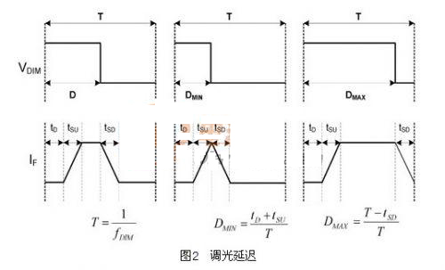 對於PWM調光訊號而言,每個LED都有限定的響應時間,圖2表示三種不同的延遲,延遲愈大者表示能達到的對比度就愈低(對光強度控製的一種測量方法)。