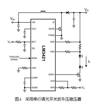 無論是升壓穩壓器或任何類型的降壓/升壓拓撲都不太適合用在PWM調光。在開始設計的時候,會發覺兩者在連續導通模式(CCM)下都會展現一個右半平麵零點(Right-half Plane Zero)限xian製zhi,這zhe將jiang無wu法fa達da到dao頻pin率lv穩wen壓ya器qi所suo需xu的de高gao控kong製zhi回hui路lu帶dai寬kuan要yao求qiu。此ci外wai,右you半ban平ping麵mian零ling點dian的de時shi域yu效xiao應ying還hai會hui使shi係xi統tong難nan以yi磁ci滯zhi方fang式shi去qu控kong製zhi升sheng壓ya或huo降jiang壓ya/升壓電路;另一個使情況變得更為複雜的因素是升壓穩壓器不能容忍輸出電壓下降到輸入電壓以下,這種情況會導致在輸入端產生短路,使得並列FET調光無法實行。另外,在各類的降壓/升壓拓撲技術中,並列FET調光仍然窒礙難行或極難使用,主因在於它需要輸出電容器(SEPIC、降壓/升壓和返馳式),又或在輸出短路時會出現無法控製的輸入電感器電流(Cuk和Zeta)。