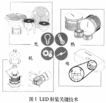 LED 的封裝技術實際上是借鑒了傳統的微電子封裝技術,但LED 有其獨特之處,又不能完全按照微電子封裝去做。整個LED 封裝工藝主要包括封裝原料的選取、封裝結構的設計、封裝工藝的控製以及光學設計與散熱設計,概括來講就是熱- 電- 機-光(T.E.M.O.),如圖1 所示,這是LED封裝的關鍵技術。
