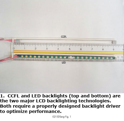 典型的LCD背光可以是1個或多個冷陰極熒光燈(CCFL),或是一組發光二極管(LED)陣列。圖1分別給出了采用這兩種技術的一個例子。背光圖像的質量在很大程度上取決於背光驅動器。在本文中,我們將討論有助於CCFL和LED發展的一些注意事項,以及如何為這兩種背光供電。