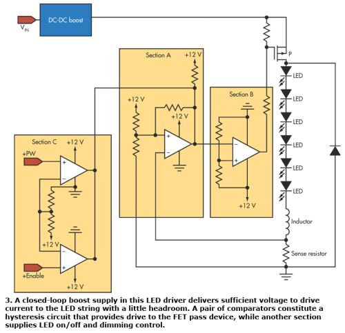 DC-DC升壓變換器是一個閉環升壓電源,它提供了足夠的電壓(至少2V的餘量)來驅動流向LED串的電流。圖中A部分顯示了一個比較器及構成正向滯後電路的相關電阻。圖中將感測電阻上的電壓與一個已知參考值作比較。圖中B部分給出了另一個比較器和用於緩衝A部分輸出相關電阻,以確保正確的滯後處理並驅動直通器件。