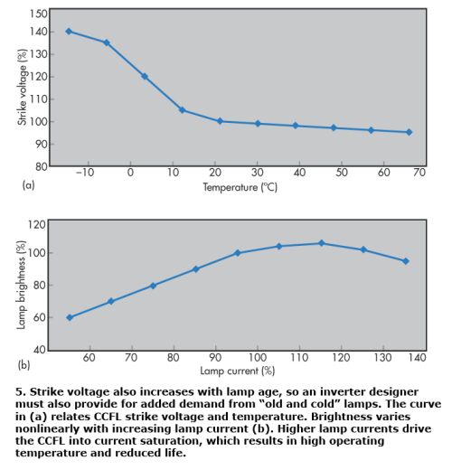 LCD工作時的環境溫度是背光驅動器設計人員需要考慮的一個關鍵因素。CCFL啟動或起始電壓與溫度成反比。圖5a顯示了CCFL起始電壓與溫度之間的典型關係,圖5b則展示了與電燈電流增大相關的CCFL亮度變化曲線。