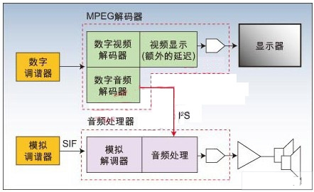 zaicongmonidianshixiangshuzidianshizhuanbiandeguochengzhong,dianshijiyexuyaonenggoutongshichulimoniheshuziyinpin。monidianshixinhaozhongdeyinpinyaoshiyongyigezizaipin,ermonitiaoxieqitongchangyouyigexuyaobeijietiaodeshengyinzhongpin(SIF)輸出。DTV平台通常有一個用於解調來自模擬調諧器的SIF輸出的模擬輸入端和一個來自解碼器的數字輸入端,後麵的解碼器用於處理MPEG數據流中的視頻和數字音頻(圖2)。