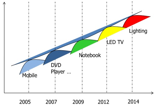綜觀LED的發展過程,2002年起LED從小尺寸顯示器(主要應用在手機上)開始滲透,在2005年達到高峰。但是隨著效率的提升,單位顯示器使用的LED顆數也逐漸減少。當手機成長趨於飽和狀態下,LED總需求量便開始下滑。在此時LED便開始尋找下一個應用:中尺寸顯示器。隨著性價比的不斷提升,LED於2007年在中尺寸顯示器的需求達到飽和,與先前小尺寸一樣LED需求開始往下。LED開始進入到另一個應用:筆記本電腦顯示器,並於2009年底開始進入電視顯示器的應用。隨著LED在大尺寸顯示器的廣泛應用,LED的性能已經提升到每瓦100流明以上,而價格也快速下降,此趨勢對於LED在照明應用的發展有著無比的助力。