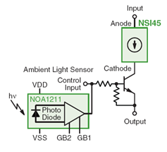 NSI45的另一個典型應用是用作顯示屏和廣告牌文字電路的恒流穩流器線性LED驅動器。其特點包括低啟動電壓,無論正向電壓(Vf)如何變化都可以實現精密穩流,具有負溫度係數特性,可以保護LED。