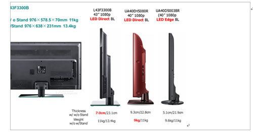 事實上,BMS模mo式shi對dui於yu品pin牌pai廠chang商shang而er言yan並bing非fei完wan全quan出chu於yu成cheng本ben考kao慮lv,而er更geng側ce重zhong於yu產chan品pin的de差cha異yi化hua,以yi及ji品pin牌pai廠chang商shang將jiang對dui渠qu道dao和he消xiao費fei者zhe的de理li解jie體ti現xian在zai具ju體ti產chan品pin上shang,這zhe對dui於yu提ti升sheng品pin牌pai廠chang商shang終zhong端duan產chan品pin競jing爭zheng力li而er言yan至zhi關guan重zhong要yao。因yin此ci,我wo們men可ke以yi發fa現xian,從cong2010年起,幾乎所有一線品牌廠商新增的係統組裝產品均為BMS模式。以下為TCL在BMS模式下生產的直下式的LED電視在基本外觀尺寸上與Samsung最新推出的直下式產品對比。從相關的指標來看,中國本土品牌在BMS一體化製造的能力已經取得了非常大的進步,甚至領先一步。