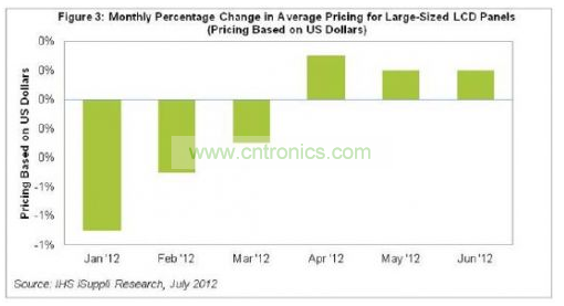 自4月以來,大尺寸液晶麵板的平均價格連續第三個月上漲,6月上漲0.2%,5月亦上漲同樣的幅度,如圖1所示。漲幅可能很小,但在不穩定的液晶麵板市場,任何變化都會遭到認真解析,尤其是考慮到1至3月價格連續下滑。大尺寸液晶麵板的定義是尺寸為10.x英寸及更大的尺寸。