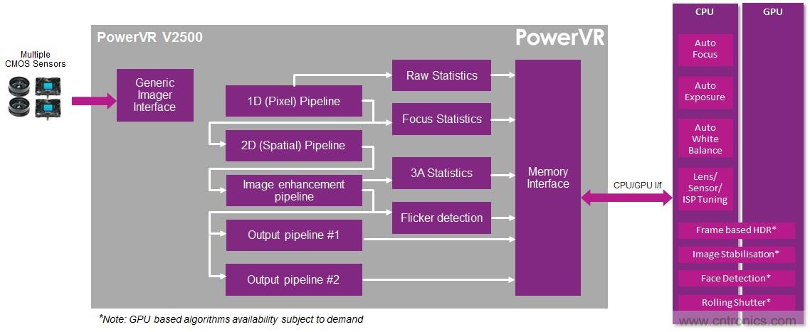 V2500 內核加入 Imagination 現有的 PowerVR 多媒體內核係列後,與新的 PowerVR Series6XT圖形處理器和 PowerVR Series5 視頻與靜態圖像編解碼器一起,形成了一個完整、整合的視覺平台,能為今天的相機應用顯著節省電源與帶寬,並為臉部和姿勢識別、增強現實等下一代內容感知應用奠定基礎。