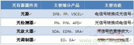 光通信器件包括光有源器件和光無源器件,有源無源按照是否需加外界能源驅動來區分。光有源器件主要負責光信號的產生、放大和接收,完成信號的光-電-光轉換和放大等功能。光有源器件包括光纖放大器、光纖激光器、光收發器和光調製器,這些器件都是光發射機、光接收機和光中繼器的關鍵器件,和光纖一起決定著基本光纖傳輸係統的水平。