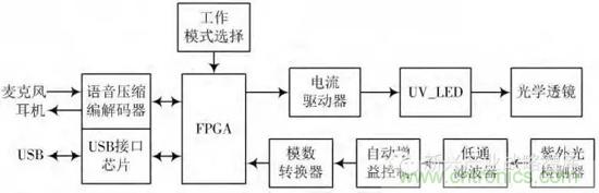 係統的核心部件是UV?LED和紫外光檢測器,此外還有一片可編程邏輯陣列(FPGA),外接語音壓縮編解碼芯片和USB接口芯片,分別用來支持語音和數據的傳輸,如圖1所示。