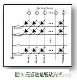 另外一種優化的無源選址驅動方式是在列掃描部分加入鎖存器,其作用是把某一時刻第X行所有像素的列掃描信號(Y1, Y2… … Yn)提前存儲在鎖存器中。當第X行被選通後,上述的Y1-Yn信號同時加載到像素上[3]。這種驅動方式可以降低列驅動信號頻率,增加顯示畫麵的亮度和質量。但仍然無法克服無源選址驅動方式的天生缺陷:連線龐雜,易串擾,像素選通信號無法保存等。而有源選址驅動方式為上述困難提供了良好的解決方案。