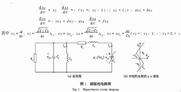 對圖1(a)中電路,取非線性電容C1極板上的電荷q1、流過電感L1中的電流il1、線性電容C2兩端的電壓uC2以及流過電感L2的電流iL2作為狀態變量,並對其進行歸一化處理後有