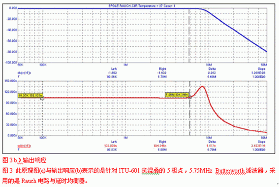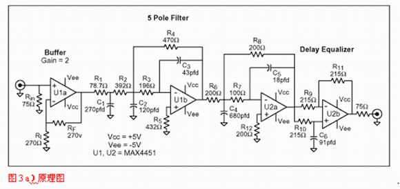 使用軟件或歸一化曲線,我們會發現-3dB帶寬為8.45MHz的5極點Butterworth濾波器就能滿足選擇性要求,但沒考慮群延時。對於後者,需要一個延時級,對於此電路,需要重點關注的運放參數為0.1dB,2VP-P帶寬。將該數值應用於式1和2可獲得精確的設計。圖3a與3b給出了一個適合此類應用的原理圖,並用曲線顯示了它的增益和群延時特性,此設計基於四倍過采樣係統。由於MAX4450/4451卓越的瞬態響應與大信號帶寬(2VP-P時175MHz),因此選擇它。