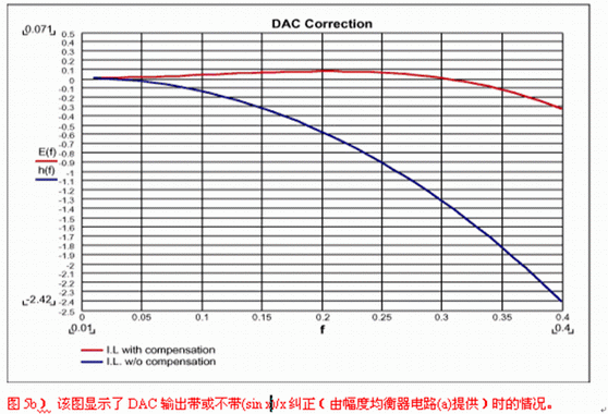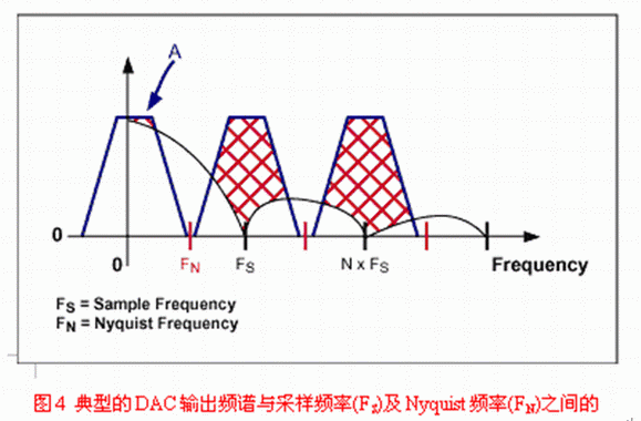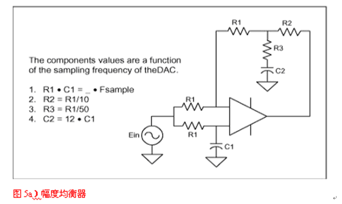 DAC之(zhi)後(hou)的(de)重(zhong)建(jian)濾(lv)波(bo)是(shi)沒(mei)有(you)被(bei)很(hen)好(hao)理(li)解(jie)的(de)應(ying)用(yong)之(zhi)一(yi)。很(hen)多(duo)設(she)計(ji)者(zhe)認(ren)為(wei)引(yin)入(ru)重(zhong)建(jian)濾(lv)波(bo)器(qi)是(shi)為(wei)了(le)濾(lv)掉(diao)采(cai)樣(yang)時(shi)鍾(zhong),但(dan)這(zhe)遠(yuan)不(bu)是(shi)事(shi)實(shi)。當(dang)信(xin)號(hao)被(bei)采(cai)樣(yang)時(shi),采(cai)樣(yang)中(zhong)包(bao)含(han)了(le)多(duo)個(ge)重(zhong)複(fu)的(de)信(xin)號(hao)映(ying)像(xiang),分(fen)別(bie)對(dui)準(zhun)采(cai)樣(yang)時(shi)鍾(zhong)的(de)各(ge)次(ci)諧(xie)波(bo)。重(zhong)建(jian)濾(lv)波(bo)器(qi)將(jiang)濾(lv)掉(diao)除(chu)基(ji)帶(dai)采(cai)樣(yang)外(wai)的(de)所(suo)有(you)其(qi)他(ta)信(xin)號(hao)。如(ru)果(guo)抗(kang)混(hun)疊(die)濾(lv)波(bo)器(qi)達(da)到(dao)了(le)其(qi)目(mu)的(de),那(na)麼(me)DAC輸出看上去就像圖4中的映像A,接下來,它右邊的所有采樣都應被濾掉。因此,對於重建的要求類似於抗混疊,但是,由於每個采樣隻停留瞬間,DAC會hui將jiang每mei個ge采cai樣yang保bao持chi一yi個ge時shi鍾zhong周zhou期qi,這zhe樣yang一yi來lai,就jiu產chan生sheng了le我wo們men所suo熟shu悉xi的de逼bi近jin於yu某mou斜xie線xian的de台tai階jie狀zhuang波bo形xing。保bao持chi功gong能neng相xiang當dang於yu一yi個ge數shu字zi濾lv波bo器qi,它ta的de特te性xing類lei似si於yuButterworth或Bessel濾波器,在半采樣頻率處響應被降低了4dB。重建濾波器的第二個目的是補償這個損失,這就需要如圖5a電路那樣的幅度均衡器。該均衡器在一個延時電路的基礎上構成,具有類似於Bessel濾波器的響應。它可按照DAC采樣率(FS)來設計。圖5b顯示了采用和未用幅度均衡器時的DAC頻率響應。與延時級類似,它可以被包含在任何重建濾波器中。