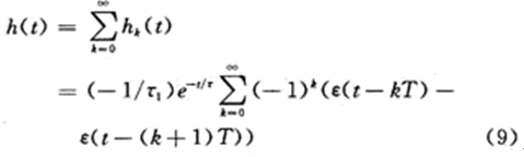 由式(8)可見,第k段的非零值時區為(kT,(k+1)T_),即各時段非零值區間互不重疊,對hk(t)關於k求和,得開關電容電路(對外)的單位衝激零狀態響應h(t)為: