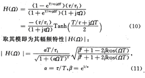上式說明,Ie(Ω)是輸入電流頻譜I(Ω)周期延拓的組合,周期為Ω0=2π/T。各電流分量流過RC並聯支路時的電壓為相應電流分量與RC支路阻抗(R/(1+jωτ),ω=Ω±(2n+1)π/T)的乘積,於是輸出電壓頻譜U(Ω)為:
