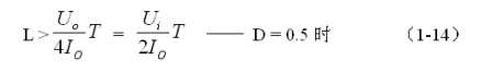 (1-13)和(1-14)式,就是計算串聯式開關電源儲能濾波電感L的公式(D = 0.5時)。(1-13)和(1-14)式的計算結果,隻給出了計算串聯式開關電源儲能濾波電感L的中間值,或平均值,對於極端情況可以在平均值的計算結果上再乘以一個大於1的係數。