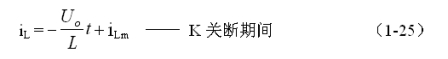 式中–Uo前的負號,表示K關斷期間電感產生電動勢的方向與K接通期間電感產生電動勢的方向正好相反。對(1-22)式進行積分得: