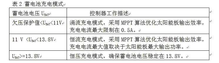 當係統檢測到環境光充足,控製器就會進入充電模式。蓄電池充電有兩個比較重要的電壓值:深度放電電壓和浮充充電電壓。前者代表在正常使用情況下蓄電池電能被用完的狀態, 而後者則代表蓄電池充電的最高限製電壓,這些參數應該從蓄電池產品手冊上可以查到。在設計電路中針對12V蓄電池,分別設置深度放電電壓為11V和浮充充電電壓為13.8V(皆為在室溫條件下的電壓值,軟件中這兩個值增加了相應的溫度補償),具體充電模式如表2所示。