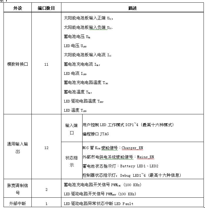 整個控製器的控製是通過一個MCU來實現,MCU的主要工作包括以下幾點:一是采用MPPT算法來優化太陽能電池板工作效率;二是針對蓄電池不同狀態采用合適的充電模式;三是保證LED驅動電路的恒流輸出;四是判斷白天黑夜並以此來切換蓄電池充電和放電模式;最後就是提供監控保護、溫度監測、狀態輸出和用戶控製輸入檢測(DIP1~4)等功能。MCU的選擇最主要是滿足ADC、GPIO和外部中斷的需要,不需要單純追求速度。表1列出了實際電路中MCU外圍設備的使用情況,考慮到以後擴展的需要,主控芯片使用STM32F101RXT6 (意法半導體最新款STM32係列MCU,采用Cortex-M3內核)。