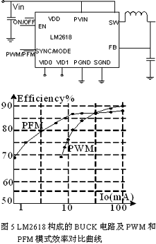 對於額定功率時工作在PWM模式的開關電源,,也可以通過切換至PFM模式提高待機效率,即固定開通時間,調節關斷時間,負載越低,關斷時間越長,工作頻率也越低。圖5是采用NS公司的LM2618控製的Buck轉換器電路和分別采用PWM和PFM控製方法的效率比較曲線。由圖可見,在輕載時采用PFM模式的電源效率明顯大於采用PWM模式時的效率,且負載越低,PFM效率優勢越明顯。