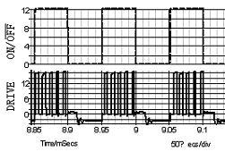 可控脈衝模式,也可稱為跳周期控製模式(SkipCycleMode)是指當處於輕載或待機條件時,由周期比PWM控製器時鍾周期大的信號控製電路某一環節,使得PWM的輸出脈衝周期性的有效或失效,如圖6所示。這樣即可實現恒定頻率下通過減小開關次數,增大占空比來提高輕載和待機的效率。該信號可以加在反饋通道,PWM信號輸出通道,PWM芯片的使能引腳(如LM2618,L6565)或者是芯片內部模塊(如NCP1200,FSD200,L6565和TinySwitch係列芯片)。