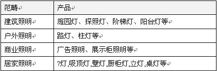 隨著技術的改善,LED燈具的用途已由過去數十年單純應用在指示燈、信號燈等,逐步使用在手機背光源、車內用照明、煞車燈、LCD電視、手提電腦背光源等輔助照明;而在近兩年內,其開始成為主照明係統,所應用的範疇可涵蓋建築、戶外、商業、及居家等,產品則分別有:
