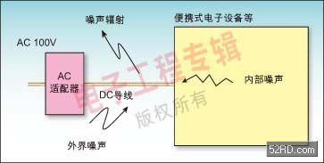 一般說來,便攜式電子設備內部的噪聲是通過DC電源線以共模的方式輸出的,像在AC適配器導線上,其噪聲可以用共模噪聲濾波器進行有效抑製。
