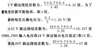 高頻變壓器的副邊繞組W6,W7,W8提供了三相逆變器3個上橋臂元件的驅動電源,W9提供了下橋臂3個元件的驅動電源(亦可用3個繞組分別提供,以避免交叉幹擾,此處隻用一組是為了簡化係統)。按逆變器開關元件對驅動電路電壓、電流的要求確定功率。本電機控製功率變換器功率模塊為IGBT,驅動模塊為EXB841。選定W2,W3,W4電壓20V,電流100mA;W5電壓20V,電流200mA。W6,W7繞組提供其他模擬電路±15V,300mA電源。W8繞組提供5V給微處理器,輸出電流為2A。W2為開關電源自身的反饋繞組,其功率很小,可忽略。