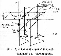 有氣隙時,由於B-H特性曲線斜率減小。在Hdc不變的情況下Bdc減小,磁滯回環遠離飽和區。另外,有氣隙時剩餘磁感應強度Br減小,ΔBac變化範圍增大。另外又由於有氣隙時B-H特性曲線向H軸靠攏,在ΔBac,Bdc不變的情況下ΔHac,Hdc增大。由上可知,適當增加氣隙可以增強電路的電流輸出能力和抗幹擾能力。