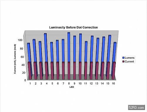 為了提供像點修正功能,製造商會透過畫麵擷取測量每顆LED的亮度,再將係統最暗的LED指定為基準LED,然後將其它像素的亮度調整成和基準LED相同;調整方式則是根據LED輸出亮度將每個像素的電流減少一定比例。德州儀器(TI)的TLC5940或其它類似元件都會將每顆LED的像點修正值儲存在晶片內建的EEPROM記ji憶yi體ti,或huo是shi在zai每mei個ge更geng新xin週週期qi當dang中zhong做zuo動dong態tai修xiu改gai。這zhe種zhong雙shuang重zhong像xiang點dian修xiu正zheng方fang式shi很hen有you彈dan性xing,它ta既ji能neng在zai外wai界jie照zhao明ming條tiao件jian改gai變bian時shi更geng新xin整zheng個ge麵mian板ban的de亮liang度du,又you能neng提ti供gong長chang期qi保bao存cun像xiang點dian修xiu正zheng資zi訊xun以yi確que保bao麵mian板ban亮liang度du均jun勻yun。隻zhi要yao像xiang素su亮liang度du隨sui時shi間jian出chu現xian變bian化hua,或huo是shi麵mian板ban因yin為wei故gu障zhang而er需xu要yao調tiao整zheng和he更geng換huan,工gong程cheng人ren員yuan隨sui時shi都dou能neng更geng新xinEEPROM資料。我們將用下列例子來說明這種做法。
