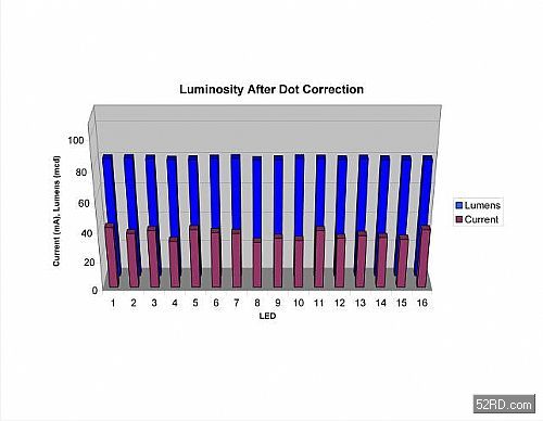 TLC5940之類的元件最多能驅動16顆LED,每顆元件隻需要一顆電阻來設定最大電流值。選擇此電阻時應確保其設定之電流足以讓最暗的LED發出80毫燭光,LPE675元件資料表顯示它需要43mA的驅動電流才能發出80毫燭光。設計人員可在安裝時先測量LED在43mA滿電流時所發出的亮度,然後產生類似圖1的亮度直方圖。圖中第一排資料是以mA為單位的LED電流值,第二排則是以毫燭光為單位的LED亮度值。從圖中可看出LED亮度在未采用像點修正功能時最多相差±10%,這種差異程度是高階顯示器無法接受的。驅動元件可以根據直方圖所示資料個別調整、或是「像素修正」每顆LED的電流,使它們最後得以產生均勻亮度;例如它必須將滿電流下的LED1亮度從83毫燭光調整至80毫燭光。TLC5940提供6位元(64階)像點修正功能,其中每一階都相當於滿刻度的1.56%。