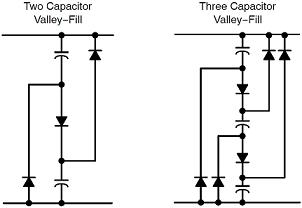 業界有關無源(Passive)功率因數校正(PFC)的方案眾多,這些方案通常都使用較多的額外元器件,其中的一種方案就是穀底填穀(valley-fill)整(zheng)流(liu)器(qi),其(qi)中(zhong)采(cai)用(yong)的(de)電(dian)解(jie)電(dian)容(rong)和(he)二(er)極(ji)管(guan)組(zu)合(he)增(zeng)大(da)了(le)線(xian)路(lu)頻(pin)率(lv)導(dao)通(tong)角(jiao),從(cong)而(er)改(gai)善(shan)功(gong)率(lv)因(yin)數(shu)。實(shi)際(ji)上(shang),這(zhe)個(ge)過(guo)程(cheng)利(li)用(yong)高(gao)線(xian)路(lu)電(dian)壓(ya)以(yi)低(di)電(dian)流(liu)給(gei)串(chuan)聯(lian)電(dian)容(rong)充(chong)電(dian),然(ran)後(hou)在(zai)較(jiao)低(di)電(dian)壓(ya)時(shi)以(yi)較(jiao)大(da)電(dian)流(liu)讓(rang)電(dian)容(rong)放(fang)電(dian)給(gei)開(kai)關(guan)穩(wen)壓(ya)器(qi)。典(dian)型(xing)應(ying)用(yong)使(shi)用(yong)2個電容和3個二極管,而要進一步增強功率因數性能,則使用3顆電容和6個二極管。
