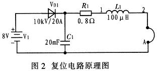 圖2中,V1為低壓直流電源,R1為限流電阻。由V1通過R1提供一個直流電流給單匝複位線圈A。在高壓脈衝變壓器工作時,單匝線圈A上會感應較高的電壓,利用電感L1,電容C1和高壓矽堆VD1對低壓直流電源V1進行保護。