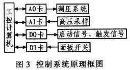 控製係統原理框圖如圖3所示。通過計算機控製AO卡(模擬量輸出)輸出0~10V的模擬量,用來控製調壓係統中的可控矽調壓器的輸出。儲能電容器上的電壓經過高壓采樣和AI卡(模擬量輸入),由計算機采集。計算機控製DO卡(數字量輸出)輸出控製信號控製各類啟動開關和IGBT驅動板輸出觸發信號。各類手動麵板的開關信號經過DI卡(數字量輸入),由計算機采集。