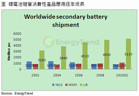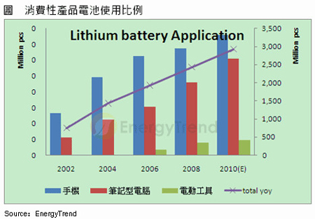 消費性產品的發展趨勢迅速牽動電池產業,根據集邦科技(TrendForce)旗下研究部門 EnergyTrend 表示,鋰電池隨著量產數量增加,價格與性能也逐漸為消費者所接受,包括手機電池與 NB 電dian池chi,也ye以yi鋰li電dian池chi為wei使shi用yong主zhu流liu,而er伴ban隨sui著zhe新xin材cai料liao的de革ge新xin,動dong力li鋰li電dian池chi也ye成cheng功gong在zai電dian動dong工gong具ju以yi及ji兩liang輪lun車che輛liang上shang嶄zhan露lu頭tou角jiao,讓rang鋰li電dian池chi突tu破po僅jin有you消xiao費fei性xing產chan品pin的de應ying用yong局ju限xian。