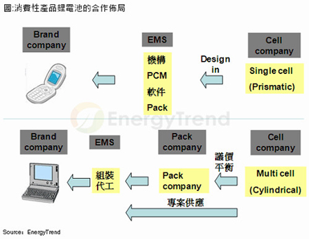 以產品發展競爭來看,EnergyTrend表(biao)示(shi),手(shou)機(ji)以(yi)及(ji)筆(bi)記(ji)本(ben)電(dian)腦(nao)一(yi)直(zhi)是(shi)鋰(li)電(dian)池(chi)的(de)最(zui)大(da)戰(zhan)場(chang),但(dan)也(ye)因(yin)為(wei)產(chan)業(ye)平(ping)衡(heng)的(de)關(guan)係(xi)而(er)產(chan)生(sheng)出(chu)不(bu)同(tong)的(de)合(he)作(zuo)模(mo)式(shi)。以(yi)手(shou)機(ji)電(dian)池(chi)來(lai)說(shuo),中(zhong)端(duan)與(yu)低(di)端(duan)產(chan)品(pin)市(shi)場(chang),大(da)多(duo)以(yi)價(jia)格(ge)為(wei)考(kao)量(liang),也(ye)因(yin)此(ci)將(jiang)使(shi)得(de)產(chan)品(pin)定(ding)位(wei)陷(xian)入(ru)品(pin)質(zhi)與(yu)價(jia)格(ge)之(zhi)間(jian)的(de)掙(zheng)紮(zha),而(er)高(gao)價(jia)位(wei)產(chan)品(pin),則(ze)必(bi)須(xu)藉(ji)由(you)在(zai)產(chan)品(pin)設(she)計(ji)初(chu)期(qi)的(de)共(gong)同(tong)發(fa)展(zhan),來(lai)設(she)法(fa)讓(rang)零(ling)組(zu)件(jian)產(chan)品(pin)確(que)保(bao)切(qie)入(ru)供(gong)應(ying)鏈(lian),包(bao)括(kuo)正(zheng)崴(wai)等(deng)手(shou)機(ji)電(dian)池(chi)廠(chang)即(ji)為(wei)一(yi)例(li)。