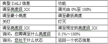 在DALI中調光信號用8位二進製,“0”表示關斷,采用對數調光曲線,變化範圍為0.1%~100%,二進製的調光信號“1”對應0.1%的發光亮度,所有的DALI調光電子鎮流器都應滿足這個對數調光曲線,以使人眼感到調光為線性變化規律。一些典型的DALI調光命令如表1所示。現DALI在歐洲已得到了廣泛的應用(如OSRAM公司和PHILIPS公司都有許多相關產品推出),是一種采用數字通信協議來傳送指令信息的雙線係統,對雙向傳送的數字控製信息流格式在DALI中都有所規定。