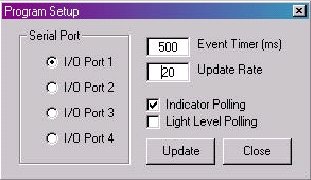端口選擇、指示器和燈發光電平的輪詢、事件定時器、更新率選擇等。如圖3表示程序設置工作界麵所示。