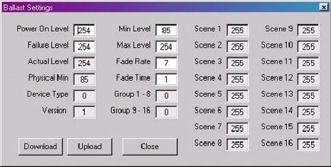 當程序第一次加載時,“電子鎮流器設置(Ballastsetting)”窗口將沒有數據顯示,要完成一隻實際電子鎮流器的設置,應在主界麵設置適應的地址,並按下“電子鎮流器設置(Ballastsetting)”窗口中的“Down/Load”按鈕。