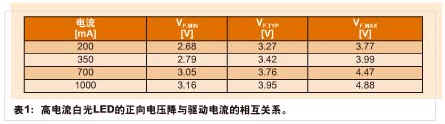 為了確保最佳的性能和長久的工作壽命,LED需要一個有效的驅動電路。這些特殊的驅動電路必須能夠從一根相當苛刻的汽車電源總線獲取工作電源,而且還應兼具成本和空間“效益性”。為了維持其長久的工作壽命,一定不得超過LED的電流和溫度限值。表1羅列了針對一個高電流白光LED的典型正向電壓與驅動電流的相互關係。