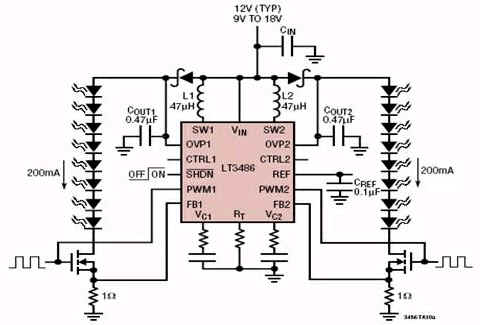 為了實現這些LED刹車燈的性能和工作壽命的最大化,應采用一種能夠驅動這些刹車係統所需的紅光LED串的合適LED驅動器,這是必不可少的。淩力爾特的LT3486便是專為此類汽車應用而開發的。LT3486是一款雙通道升壓型DC/DC轉換器(如圖2所示),專為從一根12V至14V汽車總線以恒定的電流來驅動多達16個LED(每個轉換器驅動8個串聯LED)而設計。采用LED串聯的方式能夠提供相等的LED電流,從而獲得均勻的LED亮度。在需要的時候,兩個獨立的轉換器還能夠驅動不對稱的LED串。
