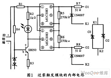 由you於yu切qie除chu的de電dian容rong器qi上shang一yi般ban都dou有you剩sheng餘yu電dian壓ya,而er電dian容rong器qi兩liang端duan的de電dian壓ya不bu能neng突tu變bian,因yin此ci,當dang係xi統tong電dian壓ya和he電dian容rong器qi殘can壓ya的de差cha值zhi較jiao大da時shi,觸chu發fa晶jing閘zha管guan會hui產chan生sheng很hen大da的de衝chong擊ji電dian流liu,而er可ke能neng直zhi接jie損sun壞huai晶jing閘zha管guan。為wei了le實shi現xian動dong態tai無wu功gong補bu償chang裝zhuang置zhi快kuai速su響xiang應ying,同tong時shi又you保bao證zheng投tou切qie無wu衝chong擊ji電dian流liu,因yin此ci需xu要yao檢jian測ce電dian容rong器qi電dian壓ya和he電dian網wang電dian壓ya。隻zhi有you當dang兩liang者zhe大da小xiao相xiang等deng、極性相同時,才能瞬時投入電容。因此需要加裝過零觸發模塊。目前,從晶閘管兩端取得過零信號的典型觸發電路是MOC3083。MOC3083芯片內部有過零觸發判斷電路,它是為220V電網電壓設計的專門芯片,其芯片的雙向可控矽耐壓為800V。在4、6兩端電壓低於12V時,如果輸入觸發電流,其內部的雙向可控矽導通。圖1所示是用在380V電網的TSC電路上串聯兩隻MOC3083的過零觸發模塊的內部電路圖。