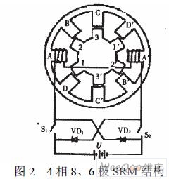 磁阻電機是SRD係統的執行元件。一般采用凸極定子和凸極轉子,即雙凸極結構,並且定、轉子齒極數(簡稱極數)不相等,定子裝有集中繞組,直徑方向相對的兩個繞組串聯成為“一相”;轉子由疊片構成,沒有繞組、換向器、集電環等。SR電機可做成單相、兩相、三相、四相和多相,相數越多,性能越好,但結構複雜,主開關器件多,成本較高,故相數不宜太多。圖2所示為一台4相8/6極SR電機示意圖。定子有8個齒,轉子有6個齒。每個定子齒上繞有一個線圈,其中徑向相對的兩個極的線圈串聯構成一相繞組,共有4組繞組,轉子上無繞組。