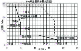 但(dan)其(qi)變(bian)量(liang)特(te)性(xing)可(ke)用(yong)來(lai)降(jiang)低(di)對(dui)伺(si)服(fu)電(dian)機(ji)的(de)扭(niu)矩(ju)負(fu)載(zai),故(gu)降(jiang)低(di)其(qi)電(dian)流(liu)及(ji)其(qi)發(fa)熱(re),使(shi)在(zai)需(xu)要(yao)極(ji)低(di)流(liu)量(liang)的(de)保(bao)壓(ya),保(bao)壓(ya)時(shi)間(jian)能(neng)夠(gou)更(geng)長(chang)。這(zhe)在(zai)油(you)研(yan)公(gong)司(si)的(de)雙(shuang)排(pai)量(liang)設(she)計(ji)發(fa)揮(hui)了(le)出(chu)來(lai)。從(cong)下(xia)圖(tu)得(de)知(zhi),保(bao)壓(ya)及(ji)高(gao)壓(ya)合(he)模(mo)所(suo)需(xu)的(de)流(liu)量(liang)低(di)但(dan)壓(ya)力(li)高(gao),可(ke)將(jiang)變(bian)量(liang)泵(beng)轉(zhuan)為(wei)小(xiao)排(pai)量(liang),降(jiang)低(di)在(zai)低(di)速(su)時(shi)伺(si)服(fu)電(dian)機(ji)的(de)大(da)電(dian)流(liu)產(chan)生(sheng)的(de)發(fa)熱(re)。此(ci)功(gong)能(neng)連(lian)全(quan)電(dian)機(ji)也(ye)做(zuo)不(bu)到(dao)。如(ru)不(bu)用(yong)雙(shuang)排(pai)量(liang)的(de)話(hua),保(bao)壓(ya)及(ji)高(gao)壓(ya)合(he)模(mo)會(hui)超(chao)越(yue)原(yuan)排(pai)量(liang)的(de)壓(ya)力(li)流(liu)量(liang)範(fan)圍(wei),但(dan)仍(reng)在(zai)虛(xu)線(xian)的(de)超(chao)載(zai)範(fan)圍(wei)內(nei),可(ke)以(yi)作(zuo)短(duan)暫(zan)保(bao)壓(ya)及(ji)高(gao)壓(ya)合(he)模(mo)。如(ru)鎖(suo)模(mo)方(fang)法(fa)是(shi)采(cai)用(yong)機(ji)鉸(jiao),高(gao)壓(ya)合(he)模(mo)自(zi)然(ran)是(shi)短(duan)暫(zan)的(de)。直(zhi)壓(ya)鎖(suo)模(mo)如(ru)不(bu)采(cai)用(yong)單(dan)向(xiang)閥(fa)將(jiang)鎖(suo)模(mo)力(li)鎖(suo)住(zhu),便(bian)要(yao)靠(kao)電(dian)機(ji)油(you)泵(beng)不(bu)停(ting)地(di)工(gong)作(zuo)來(lai)維(wei)持(chi)鎖(suo)模(mo)力(li)。雙(shuang)排(pai)量(liang)的(de)小(xiao)排(pai)量(liang)能(neng)提(ti)供(gong)長(chang)時(shi)間(jian)的(de)保(bao)壓(ya)及(ji)高(gao)壓(ya)合(he)模(mo)。