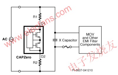 要想實現待機電流接近零的目標,就必須找到能消除R1和R2連續電流消耗的解決方案。PowerIntegrations新推出的CAPZeroIC可以輕鬆實現這一點。圖2所示為CAPZero在典型應用中的使用情況。