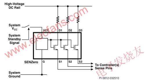 在(zai)消(xiao)除(chu)市(shi)電(dian)輸(shu)入(ru)的(de)電(dian)流(liu)消(xiao)耗(hao)之(zhi)後(hou),接(jie)下(xia)來(lai)需(xu)要(yao)消(xiao)除(chu)電(dian)路(lu)中(zhong)的(de)那(na)些(xie)即(ji)使(shi)在(zai)待(dai)機(ji)狀(zhuang)態(tai)下(xia)也(ye)會(hui)連(lian)續(xu)消(xiao)耗(hao)功(gong)率(lv)的(de)其(qi)他(ta)元(yuan)件(jian)的(de)電(dian)流(liu)消(xiao)耗(hao)。在(zai)較(jiao)高(gao)功(gong)率(lv)應(ying)用(yong)中(zhong),在(zai)高(gao)壓(ya)母(mu)線(xian)與(yu)功(gong)率(lv)因(yin)數(shu)校(xiao)正(zheng)(PFC)和DC/DC轉換器的電源控製器之間可能存在多條信號通路。例如包括PFC係統中連接升壓控製器的前饋或反饋信號通路,以及雙開關正向/LLC/半橋和全橋轉換器中的前饋信號通路。PI的第二款新產品是SENZero,它可以在不需要這些信號通路時將它們隔離,從而消除不必要的功率損耗。SENZero的典型應用如圖4所示。