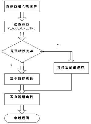 A/D轉換部分程序主要用於將采樣電阻采到的模擬電壓信號轉換為數字信號。采樣信號由IoA6輸入並直接送入緩衝器P_ADC_MUX_Data,在ADC自動方式被啟用後,會產生一個啟動信號,此時,RDY=0,DAC0的電壓模擬量與外部的采樣模擬比較,以盡快找出外部信號模擬量的數字量,A/D轉換的結果保存在SAR內。當10位A/D轉換完成時,RDY=1,此時,通過讀P_ADC_MUX_Data單元可以獲得10位A/D轉換的數據。其IRQ1中斷服務程序的流程圖如圖6所示。